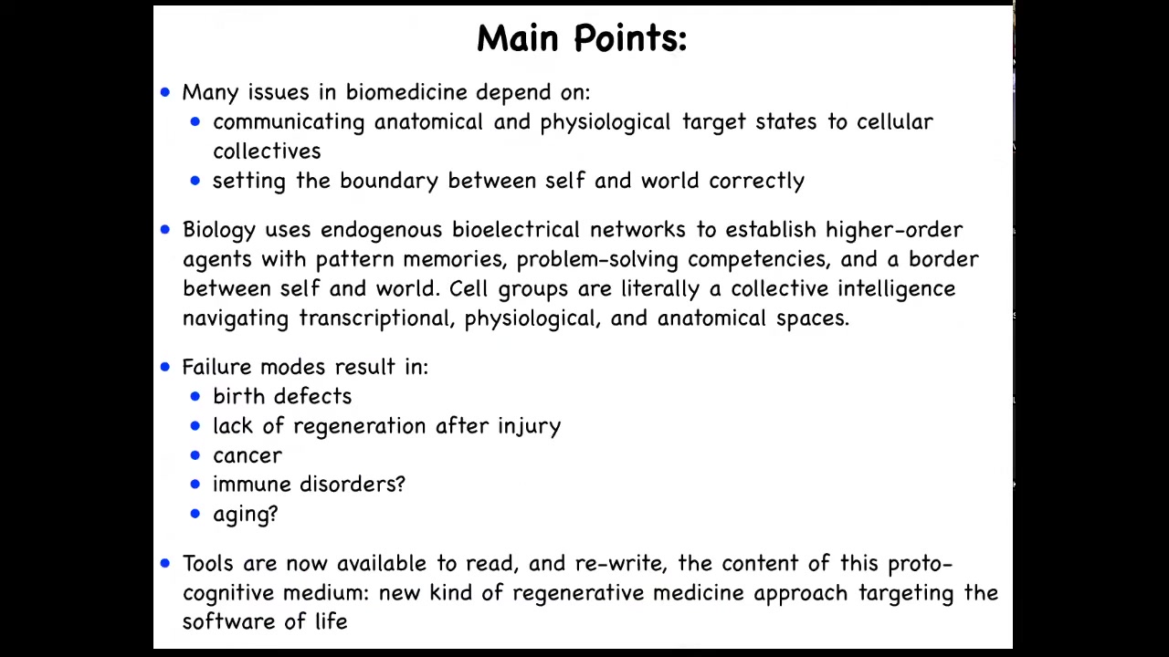 Here are the main points that I'm going to transmit today. I'm going to talk about the fact that numerous issues in biomedicine depend on two critical things. One is the ability to communicate anatomical and physiological target states, AKA goals, to cellular collectives, to groups of cells. The correct setting of the boundary between self and world is the other. This is very important, and I'll show you what I mean by this.