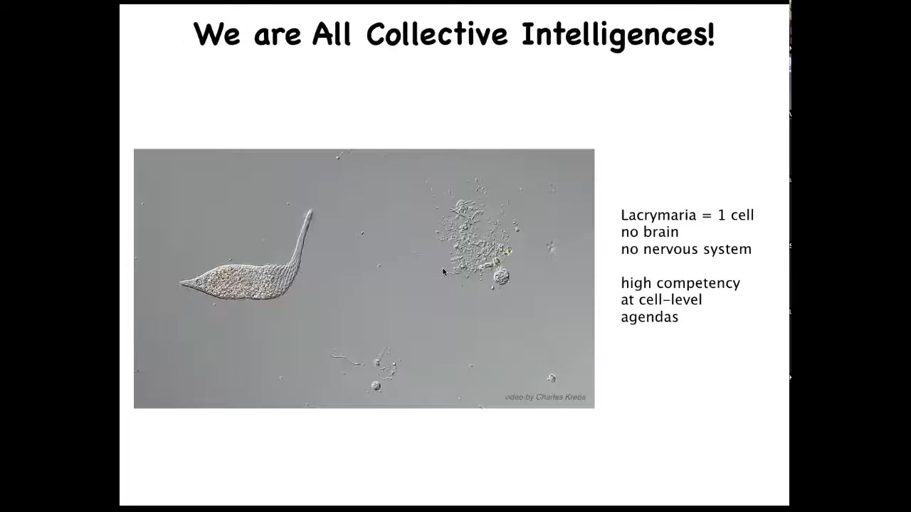All of us are collective intelligence because we're all made of things like this. This is a single cell. This happens to be a free-living organism. This is called Lacrimaria. It has no brain. It has no nervous system. But you can see that it's quite competent in all kinds of cell-level agendas. It maintains its metabolic goals, its physiological goals, its anatomical goals. It's quite good at it.