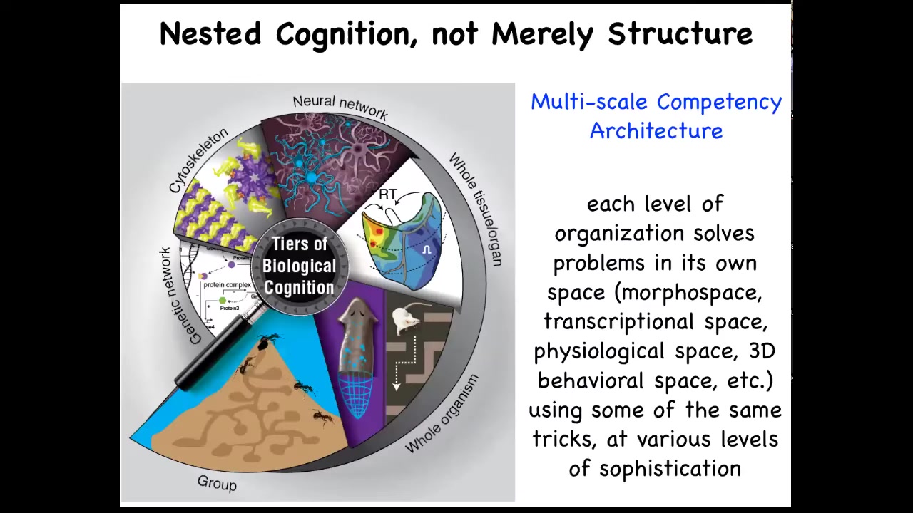 The interesting thing about biology is that each of us is made of this multi-scale competency architecture that is not just structural; we're nested dolls, groups of us are made of organisms, which are made of organs and tissues and cells and subcellular components, but each of these layers is actually solving problems in its own space. These are not merely passive sub-components. They are all competent in solving various kinds of problems.