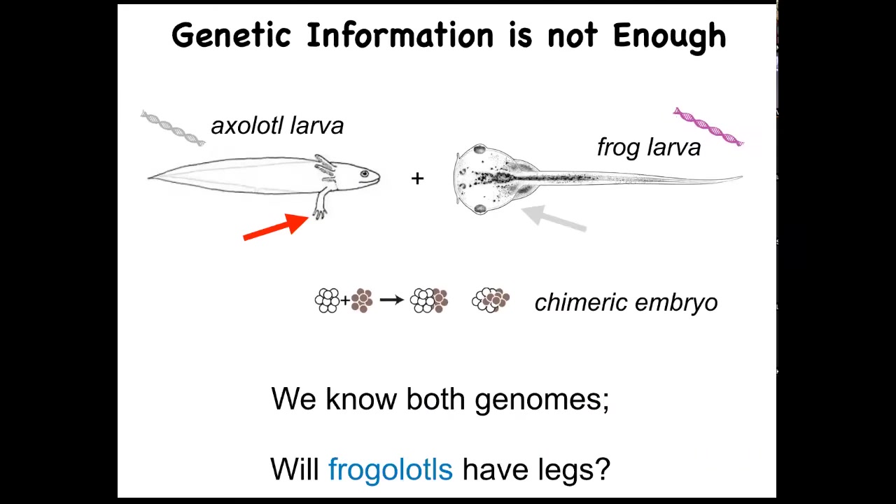 We have the frog genome and the axolotl genome; both have been sequenced. Could you tell me whether frogolotls are going to have legs or not? The answer is no. At this point, we have absolutely no models that will allow us to predict from the genetic data whether this frogolotl is going to have legs or not.
