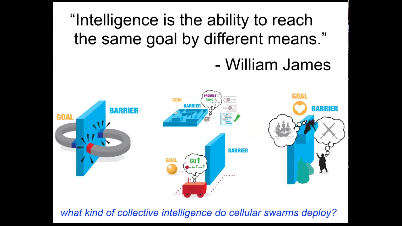 Now, what do I mean by intelligence? I'm using William James's definition. There are many definitions. I like this one. What James said was that intelligence is the ability to reach the same goal by different means. It's a nice cybernetic definition that doesn't talk about having a brain or what scale you are temporally or spatially or what space you're operating in. It's this idea that as an agent, you have goals and you have some degree of competency to get those goals met, despite various things that are going to happen.
