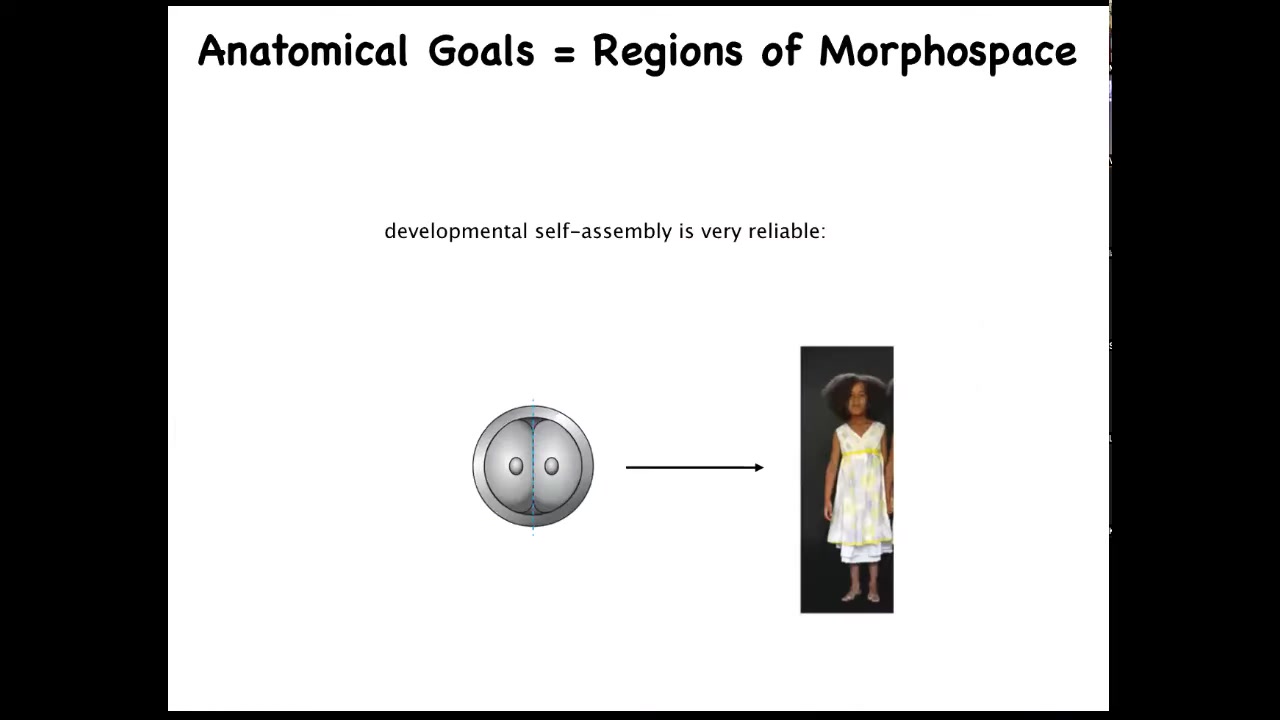 The first thing to think about is that development, while it's very reliable, most of the time this egg develops into exactly what it's supposed to be. It actually isn't hardwired because you can cut early embryos into pieces and each half — let's say you divide it in half here — you don't get a half a body, you get two perfectly normal monozygotic twins. You've got this ability to navigate to the right ensemble of states, this target morphology that we call a normal human, within normal human variation. You can navigate there from different starting positions, as a complete embryo, as a half embryo. You can even go around some local minima along the way. That's one example.