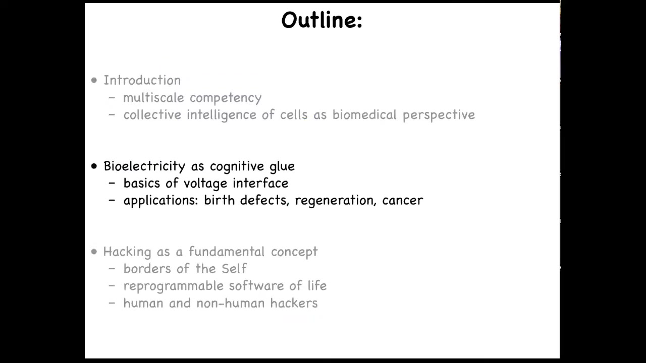 So the talk is going to come in three parts. An introduction where I set up some of the unusual perspectives that we use on all of this. Then we'll talk about bioelectricity as a kind of cognitive glue that keeps all of these cells working together. At the end, we will talk about this notion of hacking as a fundamental concept in biology.