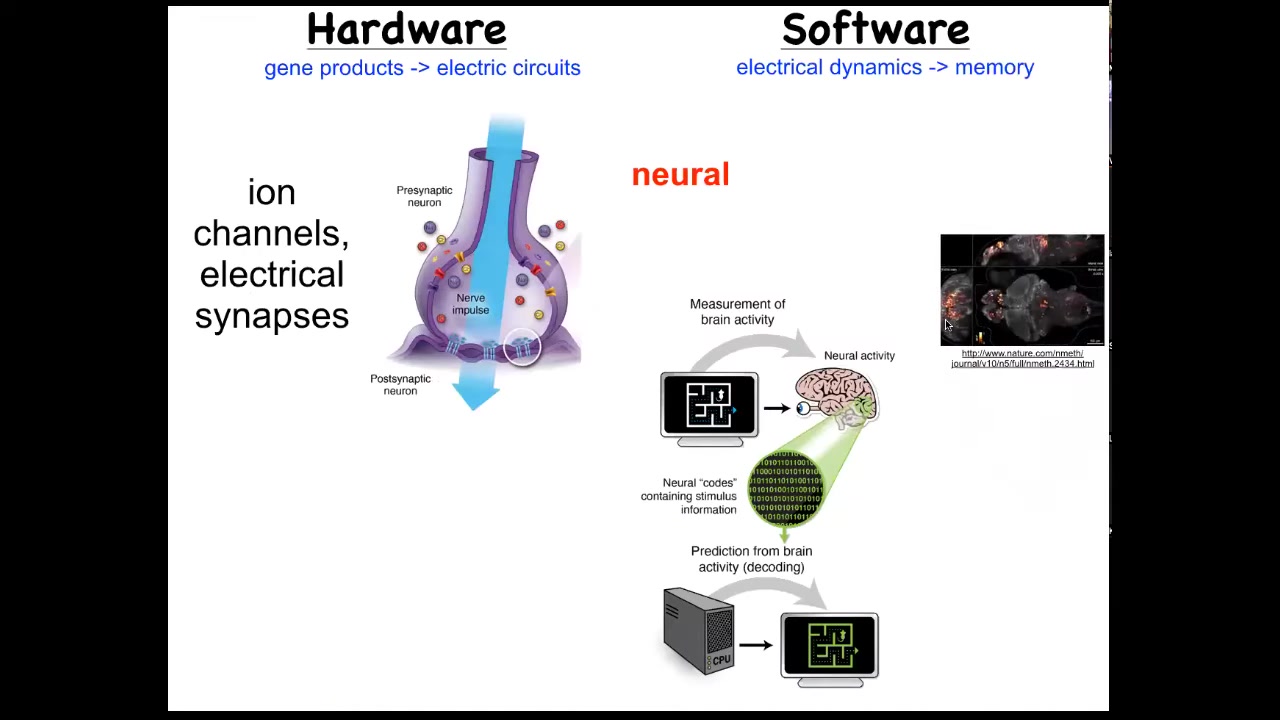 One immediately thinks of the one example where that's not controversial. In the brain, we know that there's this hardware made up of cells in the network, which have these ion channels in them. They pass ions back and forth and they get a voltage that they can then share with their neighbors through these kind of gap junctions or these electrical synapses. That hardware drives a very interesting kind of software. Here you can actually watch an amazing video of electrical activity in the zebrafish brain.