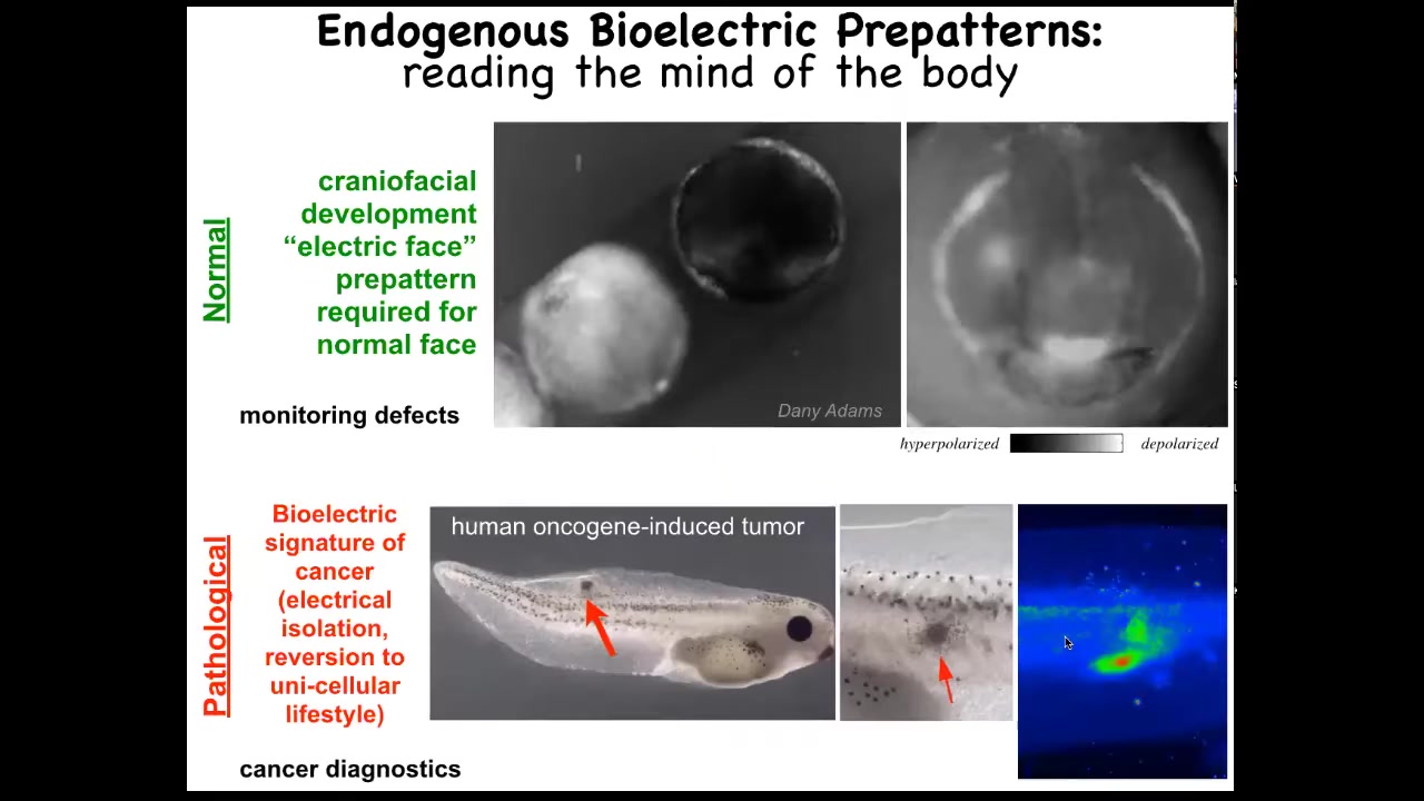 That's a normal pattern. There's also a pathological pattern where if we inject a human oncogene into this tadpole, these cells will eventually form a tumor and metastasize. But long before that, using this voltage dye you can see these cells have disconnected from the electrical network here. They're going off on their own. As far as they're concerned, they're amoebas in the big wide world. They're just treating the rest of this body as outside environment. You can track this. This is where we're working on this as a kind of cancer diagnostic tool, much like this is a birth defect monitoring tool. Tracking all of these things is important, but even more important is the ability to rewrite them.