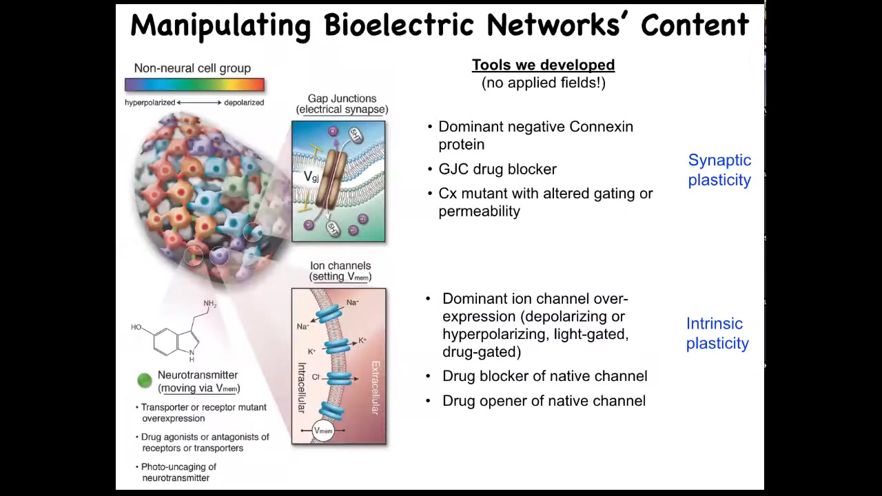 It's not just about reading these bioelectrical patterns. We need to alter them. I want to be very clear that when we alter these things, we are not using electrodes. There are no magnets. There are no waves, no frequencies, no radiation, no electromagnetic fields. What we are doing is exploiting the natural interface that these cells are using to control each other. That is the ion channels on their surface. All of these cells expose this amazing interface to each other and to us, which are ion channels and gap junctions. We now have all the tools of molecular physiology from neuroscience to control them. We can open them, we can close them. You can do this with drugs. You can use this with light as optogenetics. You can do it with genetic modification of the channels themselves. There are many ways to do it, but it's quite specific. The idea is, can we open and close these channels to induce a very specific pattern? The answer is yes, you can. I'm going to show you a few things that happen when you do that.