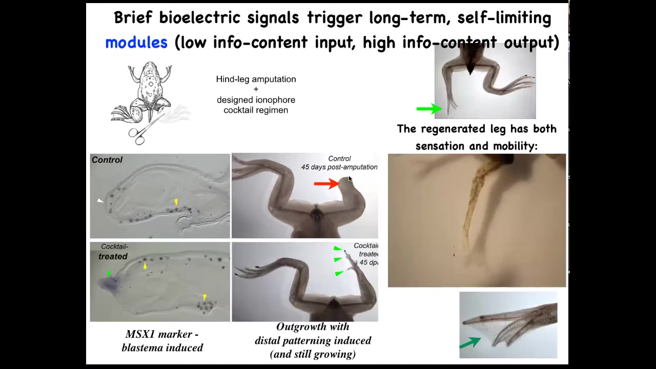 We have a cocktail of ion channel modifying drugs that immediately induces an MSX1 positive blastema. It induces, you got some by 45 days, you've already got some toes, you've got a toenail, the most distal part: a perfectly respectable leg, and it's touch sensitive and it's motile. It's functional.
