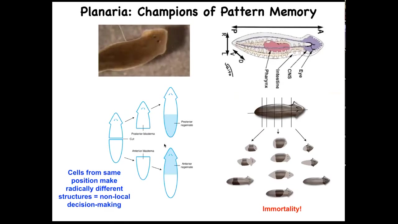 I want to shift gears to really nail this idea of these bioelectric patterns as kinds of memory. And to do that, I want to talk about a different organism. This is called planaria. These guys are these very cute little worms. They have a true brain. They have a central nervous system. They have lots of different organs and tissues, the same neurotransmitters as you and I. They have this amazing property that if you cut them into pieces, every piece regrows into a perfect little worm. That's amazing. Every piece gives rise to a complete correct anatomy.