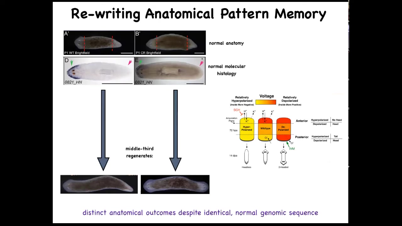 A single planarian body, a normal one-headed planarian body, can store two different representations of what to do if you get injured in the future. Two different ideas of what a correct planarian looks like.