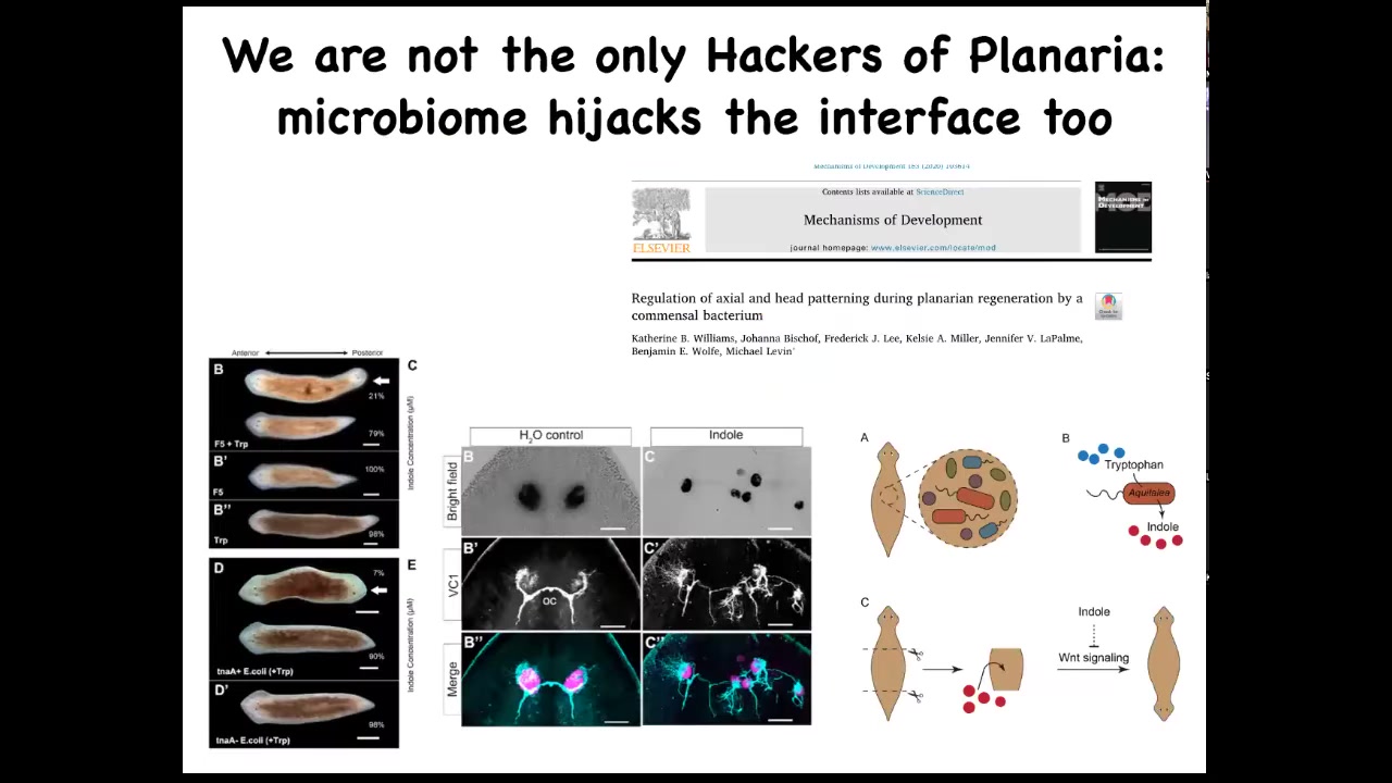 Bacteria can do it too. This is a study that we did in collaboration with Ben Wolf and Catherine Williams. Kate was an undergrad in our lab. What she found was that there are bacteria that live natively on these planaria. When we interfere with the relative proportions of the different types of bacteria, they can exert a strong influence on their host, for example, to make their host two-headed or to make radical changes in their visual system. So this is the normal: the eye spots, the optic nerves—radical changes in that visual system, all driven by, again, no genetic change, but all driven by signaling from the bacteria that are able to interface to the native controller that sets things like head number, head shape, and so on.