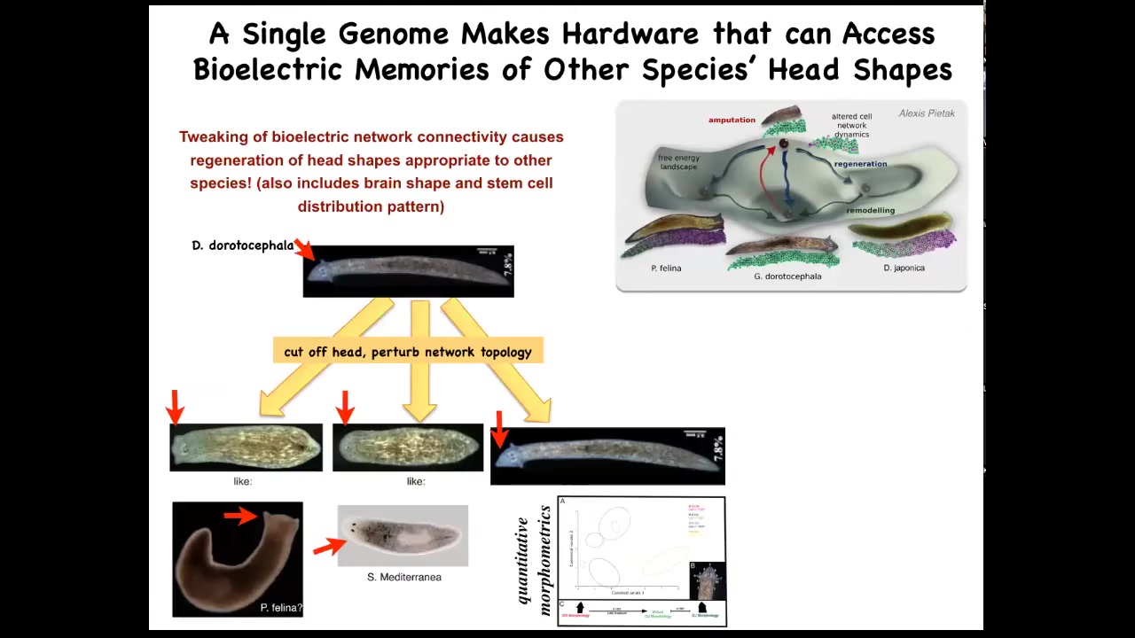 Interestingly, it's not just about head number, it's more general than that. It's about head shape as well. So if we take this nice triangular-headed planarian, amputate the head, and then confuse the bioelectrical circuit about what it should be doing, you sometimes get flat heads like this P. falina, or you get round heads like this S. mediterranean. These creatures are between 100 and 150 million years distance from this guy. Again, remember, no genetic change here. Not only the head shape, but actually the shape of the brain and the distribution of the stem cells changes to be just like these guys. So this hardware, this perfectly normal genetic hardware, is happy to visit other attractors in that morphospace that belong normally to some other species. But that hardware can go there, no problem. So you're starting to see this idea of reprogrammability. This is what I said at the beginning, the biological tissue has the ability for you to call large-scale subroutines with very simple triggers, very simple signals, and then everything else gets handled underneath. It has the ability to remember and to store new patterns that you write into it using this physiological interface. And it has the ability to visit different attractors other than what the default of the hardware normally is.