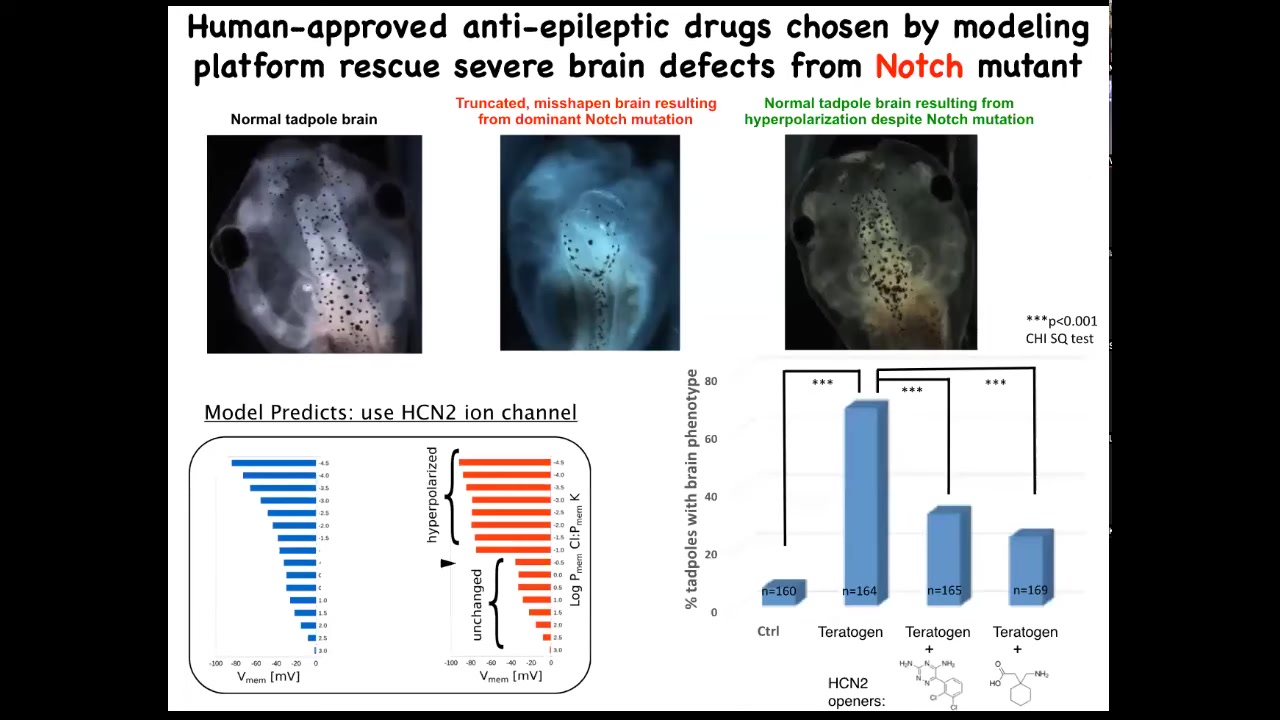 We asked, could we possibly fix this? Could we repair the state? It turns out that if you upregulate HCN2 channel activity, just like the model said, either by injecting new HCN2 RNA or by using drug openers of existing HCN2s — these are human-approved anti-epileptics — you get back to the correct brain. In fact, these animals have not only the right brain shape, but they have the right gene expression in the brain and they have the right cues back because we can do behavioral testing and they learn in a way that's indistinguishable from controls.