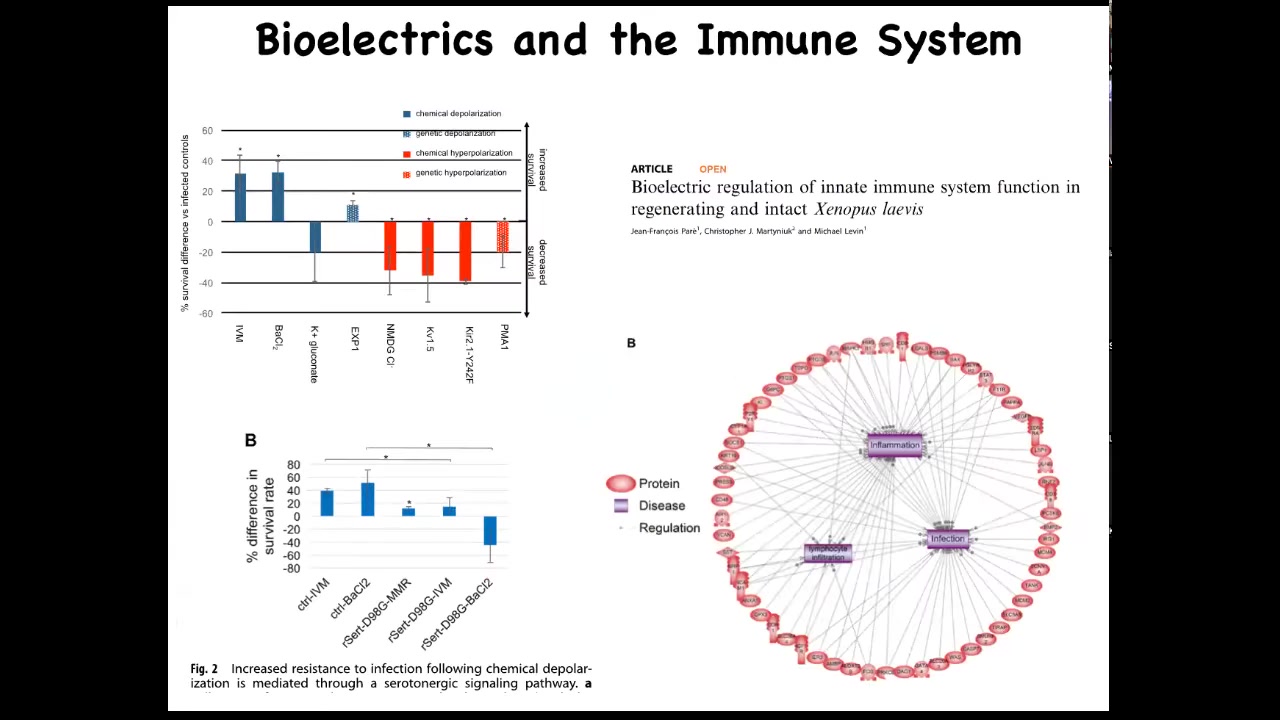 The bioelectric system also affects immune function. We studied the innate immune system and found that survival of embryos when they were challenged with a pathogenic bacteria is much improved if you hyperpolarize the tissues with specific drugs or RNAs. Some of that functionality is mediated by serotonin. If you put a serotonin transporter dominant negative, you can abrogate the activity. When we looked using next-gen sequencing, RNA-seq, we found that changes in bioelectrics alter many different targets that belong to inflammation, infection, and other immune-relevant endpoints.
