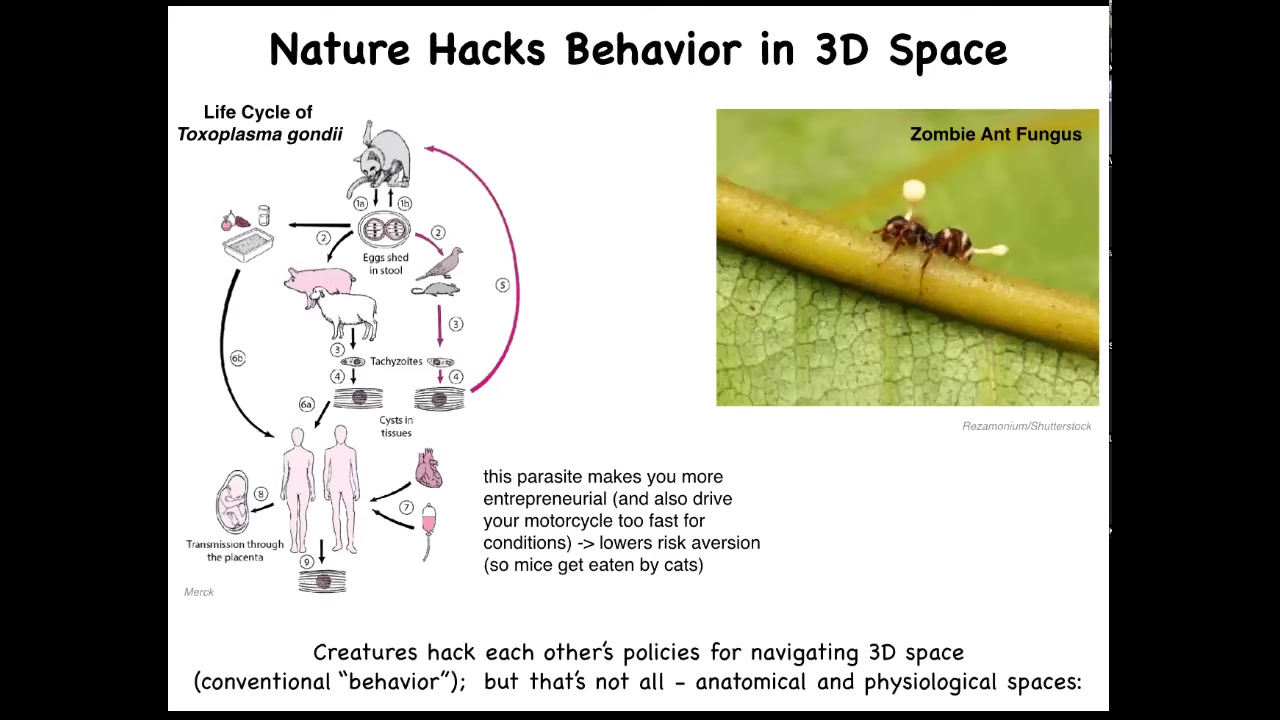 The idea is that creatures hack each other's policies for navigating three-dimensional space. There are lots of parasites that do host-altered behavior, but that's not all, because these parasites can also hack the behavior of life in anatomical and physiological spaces. What do I mean by that?