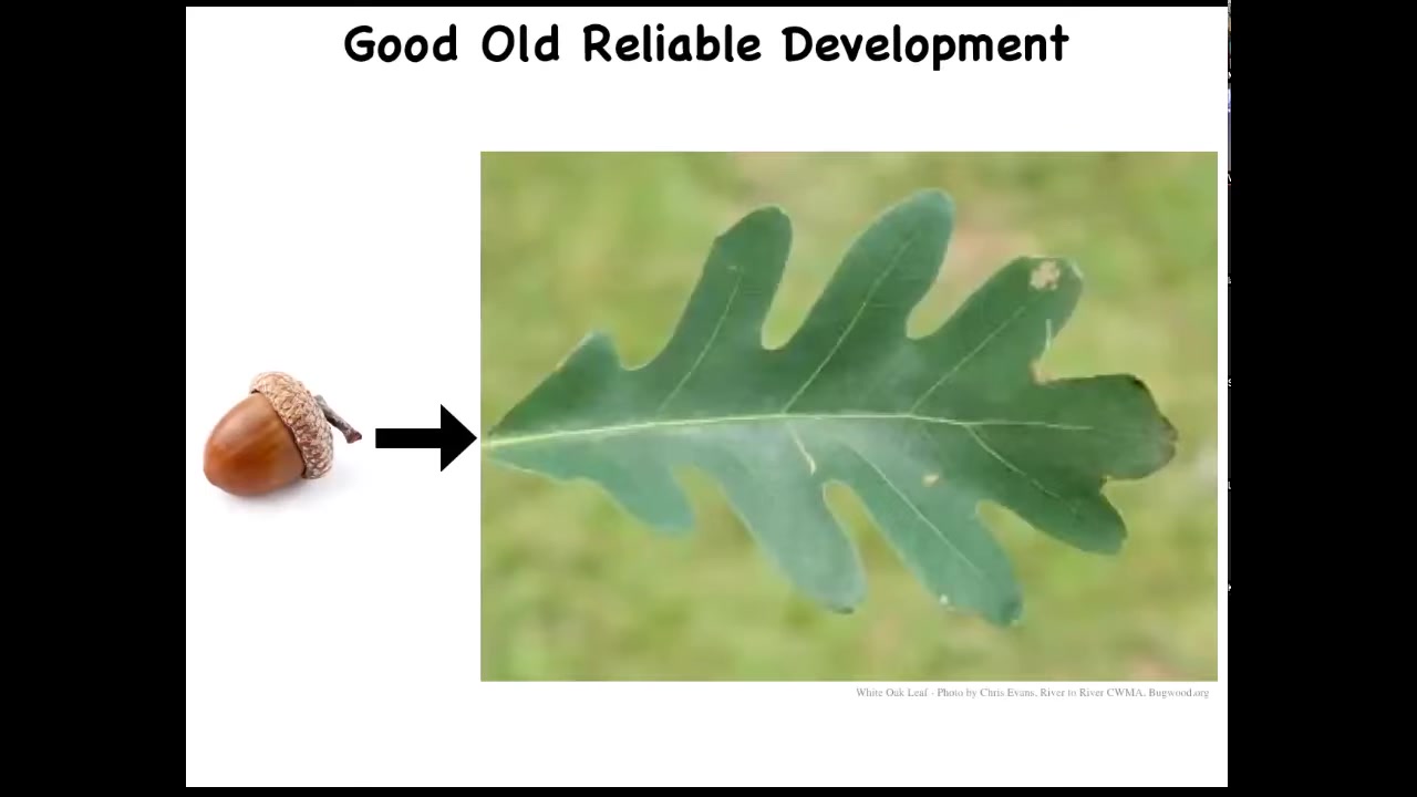 The development's amazing, but it lulls us into a false sense of understanding because we look at the reliability of this process. Here's an acorn, here's an oak leaf. We tend to think that we know what the oak genome does. It takes you on a particular path in morphospace from here to here. This is what happens 100% of the time. That's what we think the hardware encoded by the genetics knows how to do.