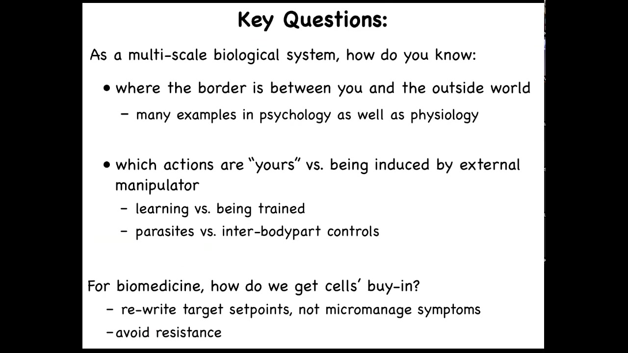 The key questions here are: as a multi-scale biological system, how do you know when you are being hacked? How do you know where the border is between you and the outside world? Which signals are yours? Which signals are coming at you from outside? And when you're born, what are you? What sensors do you have? What effectors do you have? You really don't know.