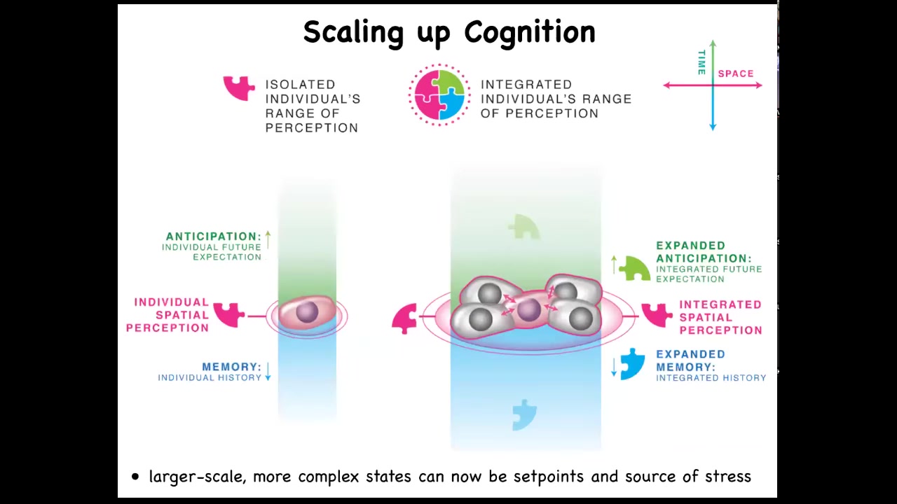 When cells get together, they are able to inflate or enlarge their cognitive light cone in space and time. They're able to perceive more signals. They're able to have larger computational capacities.