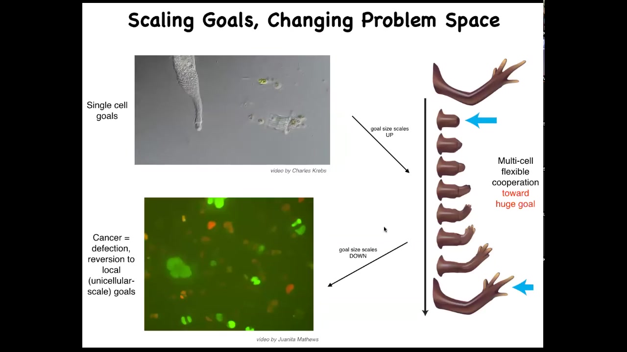 And this is what evolution has given us based on the ability for using this bioelectrical and other interfaces to scale up our goals from the tiny little goals of these cells, metabolic and so on, they scale up to these very grandiose goals of keep maintaining a limb and repairing it if anything happens to it. But that has a failure mode and that failure mode is cancer. When these cells disconnect from the electrical network, they can no longer support these complex representations of things they should be doing, they go back to a single-cell amoeba lifestyle, proliferate and migrate to wherever life is good. This is glioblastoma.