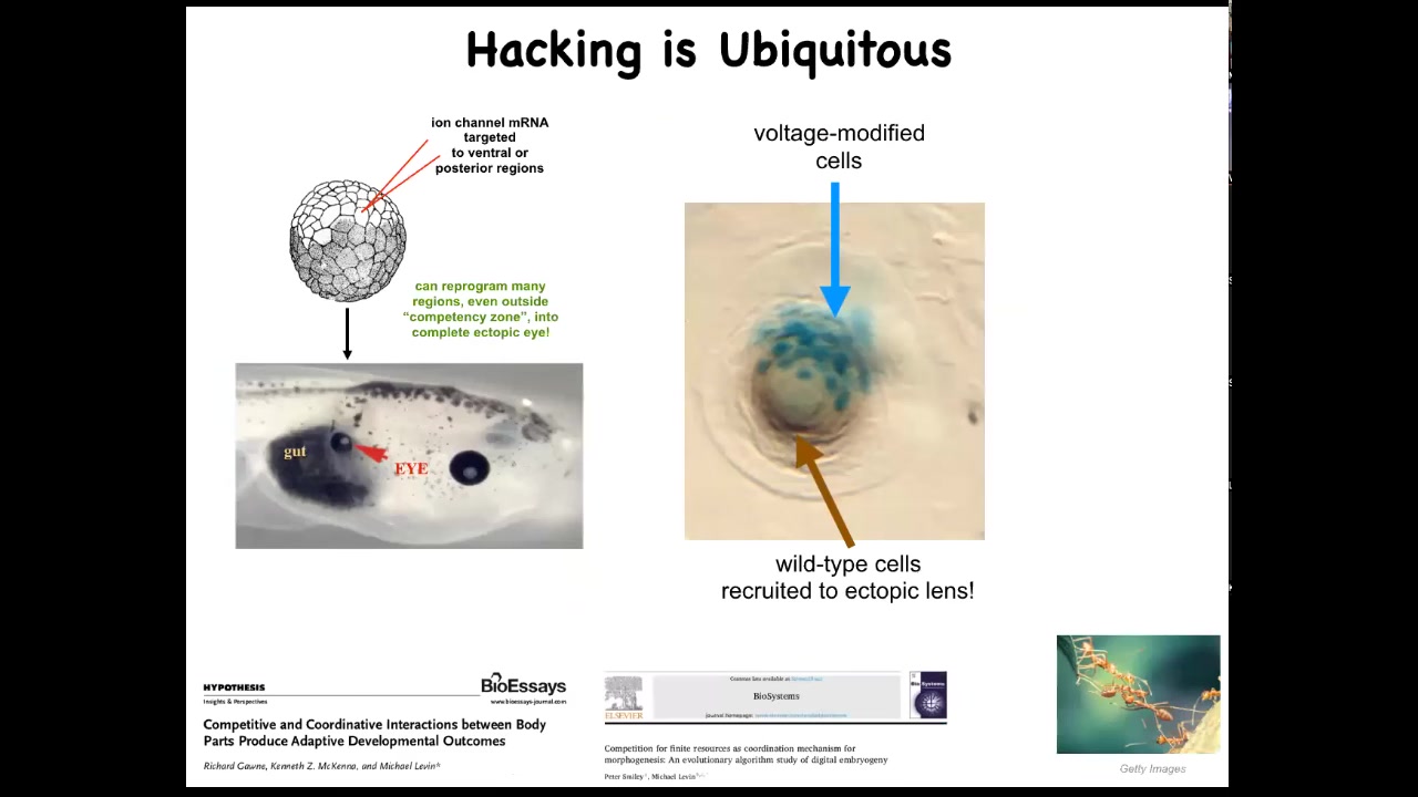 The last thing that I find really interesting here is that if you look at your developmental biology textbook, it will say that only these cells up here in the anterior neurectoderm are competent to become an eye. The reason people say that is because they've probed it with a master eye gene called PAX6. If you misexpress PAX6, indeed, you can only get eyes up here and nowhere else. Using that tool, it reveals a lack of competency in the rest of the body. But that's not the right tool. If you use bioelectric signals, in fact, you can get eyes anywhere. We've gotten them on the tail, in the gut, anywhere you want. And so that teaches us an important thing: be humble about the competencies of the material we're dealing with, because it's only as good as we are in giving it the right prompt.