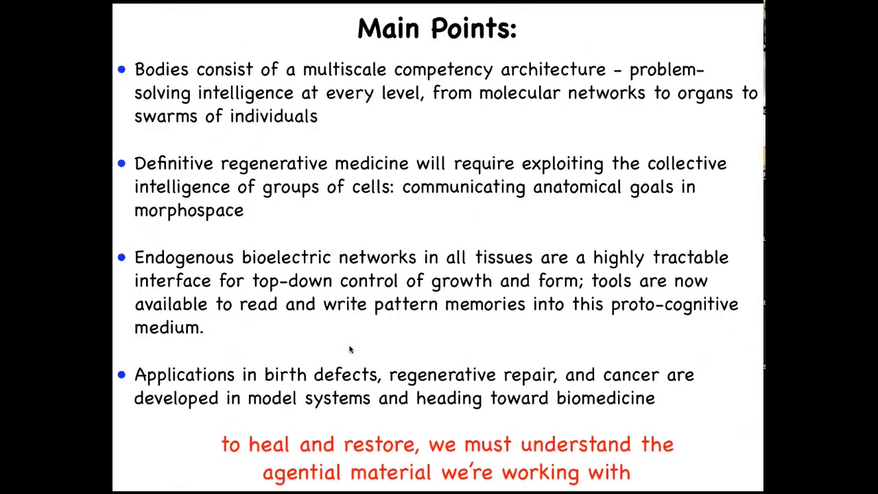 I'd like to convey the following main points today. First, I'm going to talk about how our bodies operate in a multi-scale competency architecture, a kind of problem-solving intelligence at every level of organization. I'm going to argue that definitive regenerative medicine will require us to understand the collective intelligence of groups of cells and how to communicate goals to them in one of the spaces that they live in, which is anatomical amorphous space.
