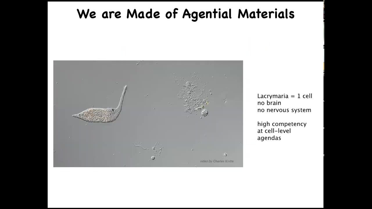 This is the kind of stuff we're made of. This is what our cells are like. This happens to be a lacrimaria. It's a free-living organism. There's no brain, there's no nervous system, there are no stem cells. This is one cell. And this creature is handling all of its physiological, metabolic, and behavioral needs in one cell. It's highly competent in the tiny goals that this thing has about its state of affairs around this little radius.