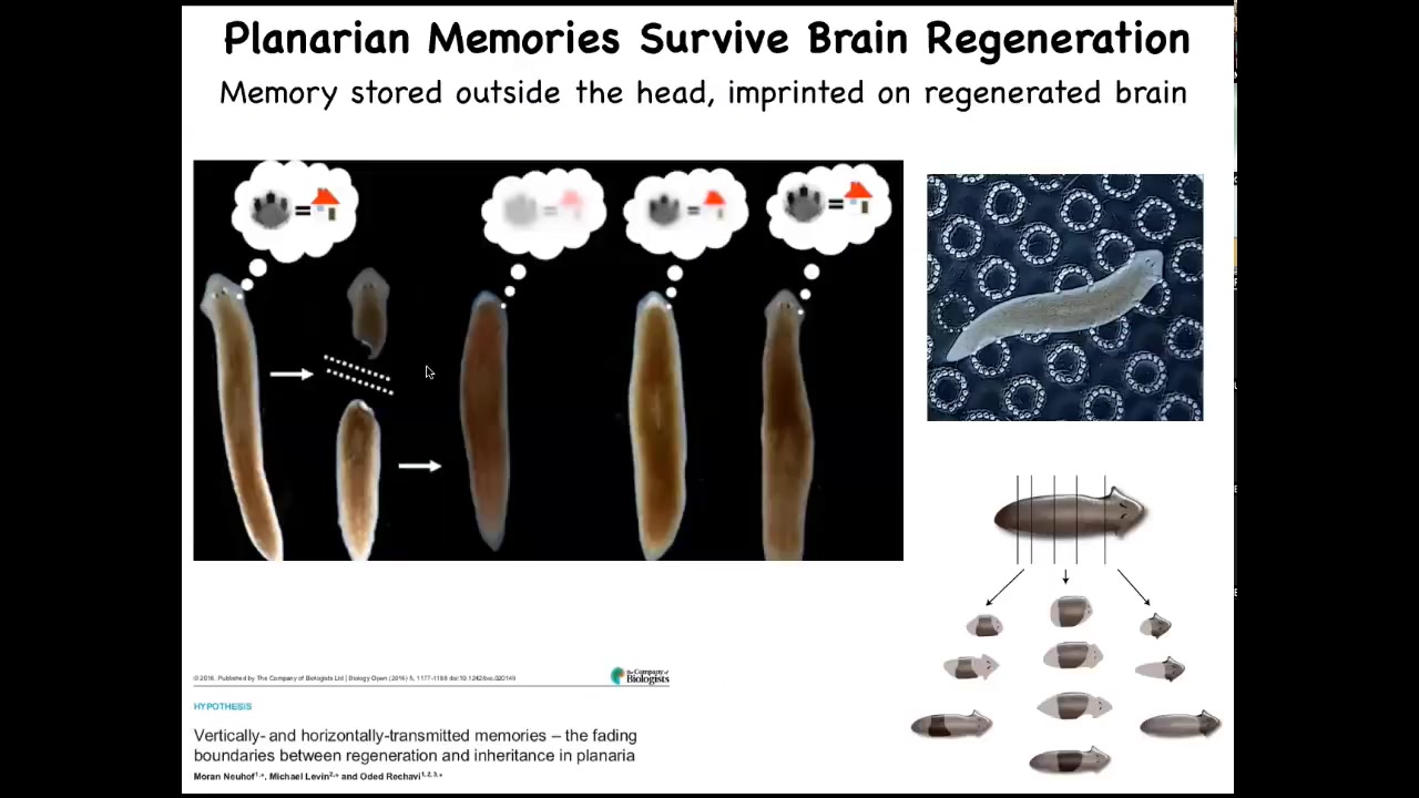 That gets even more incredible when you think about some other model systems. These are planaria. They are flatworms. One of the cool things about flatworms is that they regenerate their bodies. They regenerate from any fragments that you cut. The record is something like 275 pieces. They are also immortal, really interesting organisms. What you can do is train them. If you train them and then cut off their heads, which contains their brain, the tail will sit there doing nothing until they regrow a new head. When they regrow a new head and behavior resumes, you find out that they remember the original information.