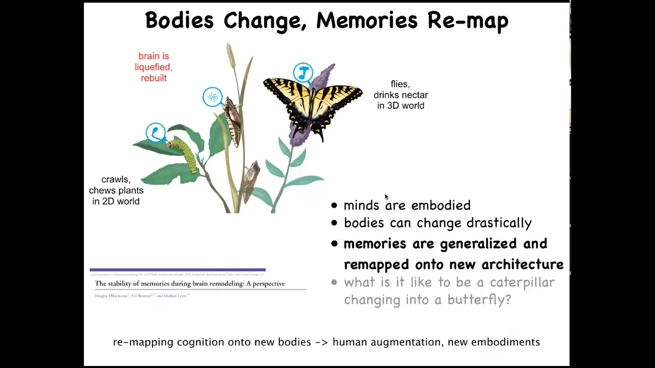 To me, one of the most interesting cases is this. This is a caterpillar. These guys are a kind of soft-bodied robot. They have no hard elements. The controller here is this brain suited for driving that type of embodiment. They live in a two-dimensional world. They crawl around and they eat leaves. But they have to become this: a hard-bodied flying kind of thing, which lives in a three-dimensional world. And it has a very different brain.