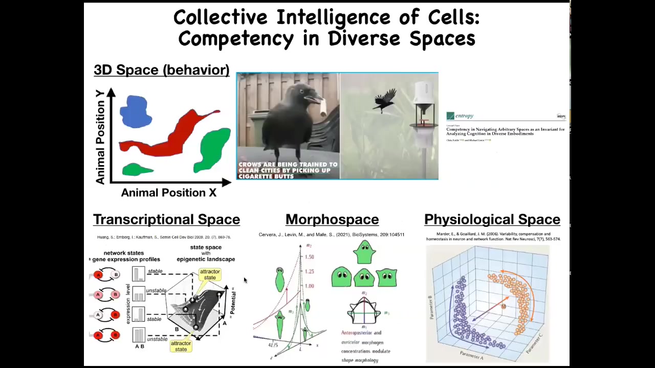 But there are all these other spaces in which living things strive and navigate and suffer and have successes and failures. There are transcriptional spaces of all possible gene expressions, physiological state spaces, and what we'll talk about most of all today, which is anatomical morphospace. These things are hard for us to recognize intelligence operating in these different spaces.