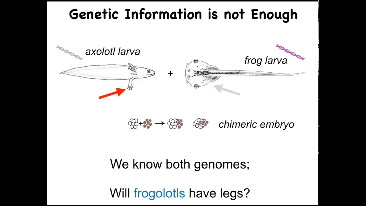 I tell you that we have the genome of the axolotl. It's been sequenced. We have the genome of the frog. That's been sequenced. I give you those genomes and ask a simple question: Would the frogolotl have legs or not? We don't have the beginnings yet of a science to figure that out from this kind of genomic data.
