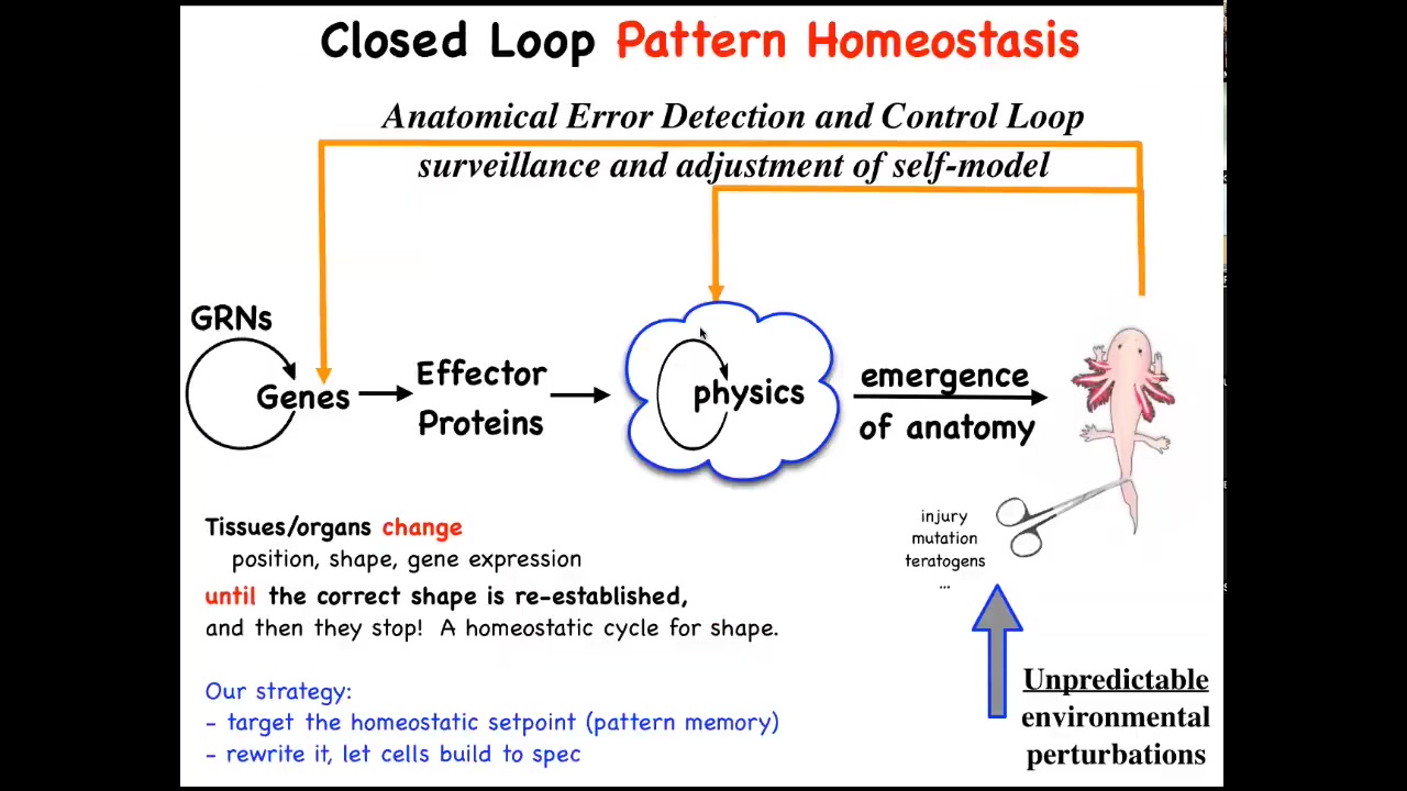 First of all, biologists know all about feedback loops and homeostasis, but typically we think about scalars like pH, temperature, hunger level—single numbers. Here, the set point is going to have to be something complex, like an anatomical representation of the thing you're trying to build. How could we possibly store a goal state like this in tissue? How could tissue remember an anatomical or geometric pattern?