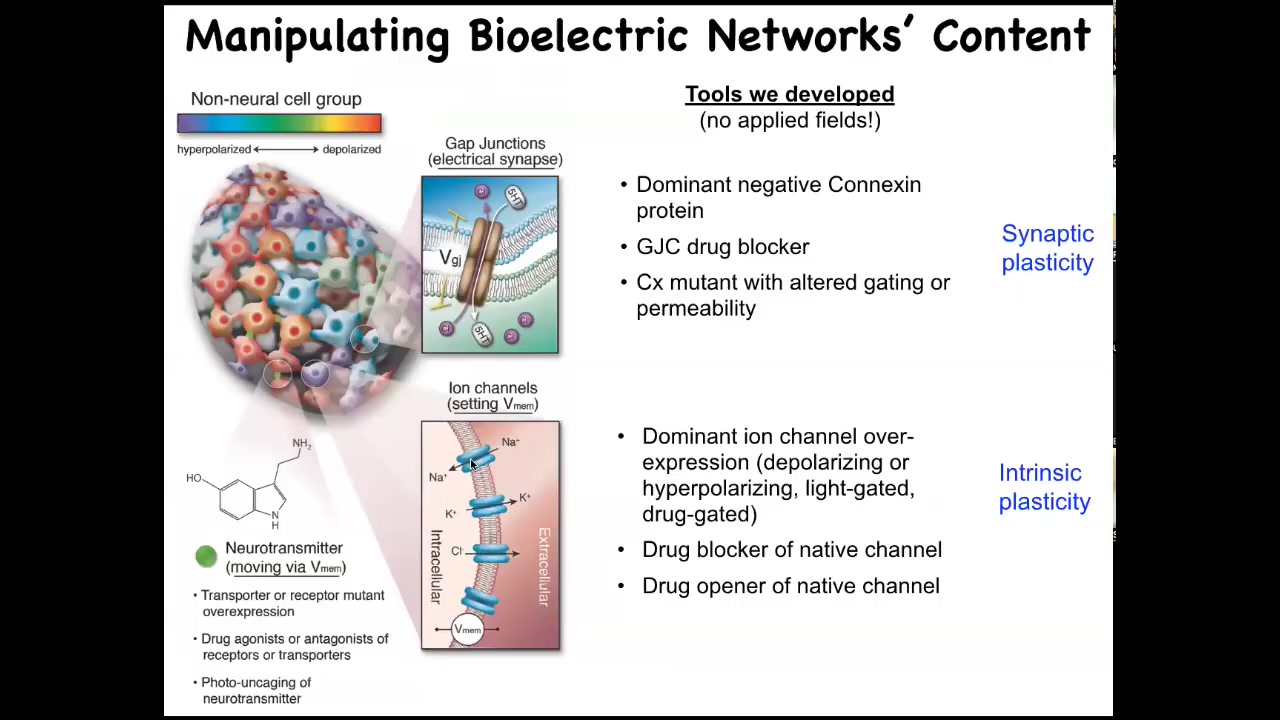 We can use all the stuff that neuroscience uses. We can use various ion channel and gap junction modifying drugs. We can mutate them genetically. We can do optogenetics and use light. What happens when you do this? What is this electrical information in the body used for? Let's modify it and see what happens. That's what we started to do when we first developed some of these tools to use these molecular reagents to control the bioelectrical state of these networks.