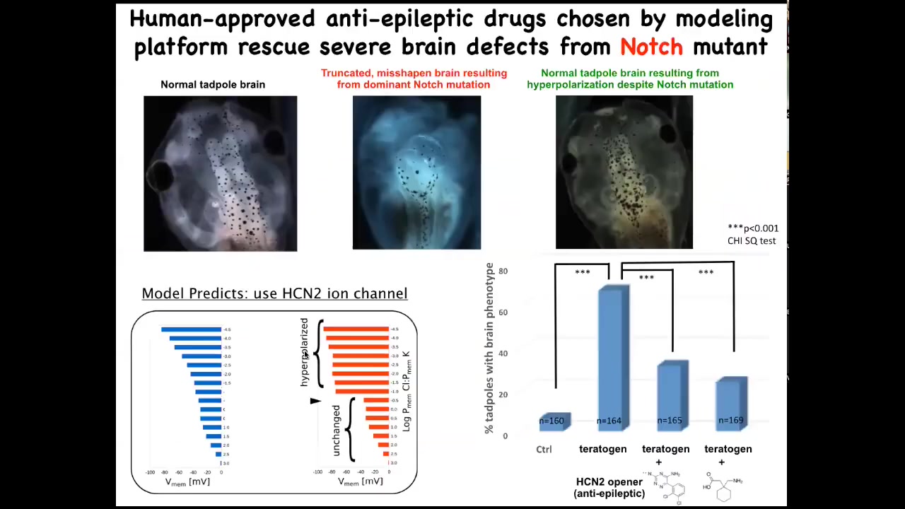 We had a computational model that told us we could open certain channels to reinforce the endogenous bioelectrical pattern that tells cells how to make a normal brain. If you do this, despite the Notch mutation being there — Notch is a very important neurogenesis gene — and it happens to be this HCN2 ion channel, if you activate or mis-express some of these channels, you get back a normal brain. Not only normal structurally and molecularly, but their behavior is normal, their IQ comes back to normal, indistinguishable from controls.
