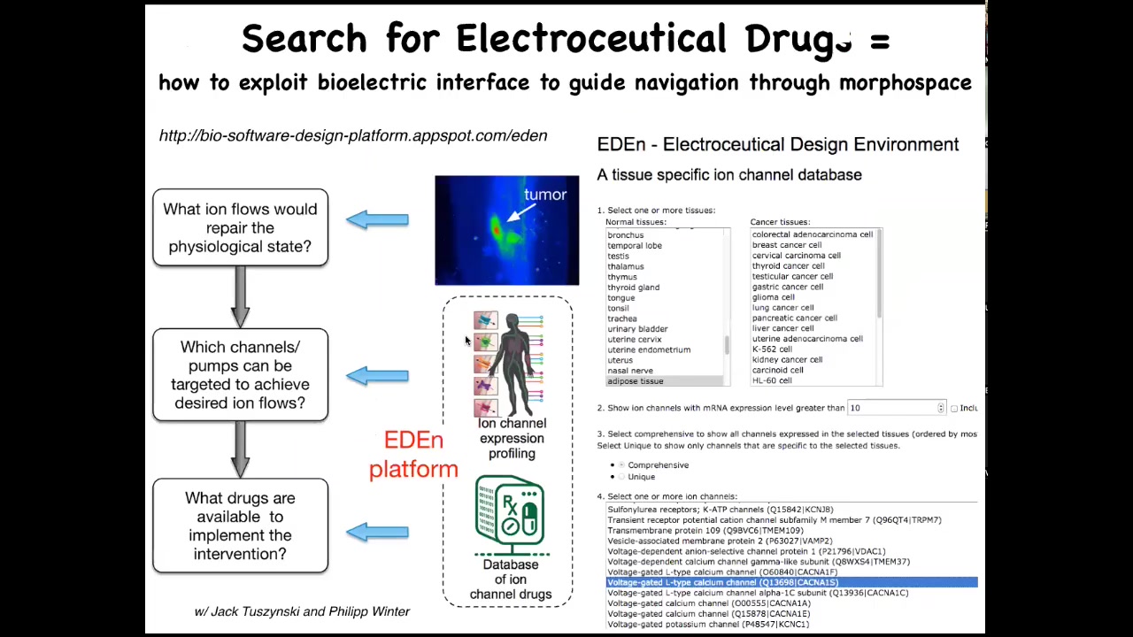Then the simulator would be able to say, these are the ion channels you need to open or close to convert the incorrect state to the correct state. Then you go and you look for drugs. Something like 20% of all drugs are ion channel drugs. This is a huge platform of electroceuticals out there that could potentially be repurposed for these kinds of bioelectric interventions if we had a system for choosing them. You can start to play with that there.