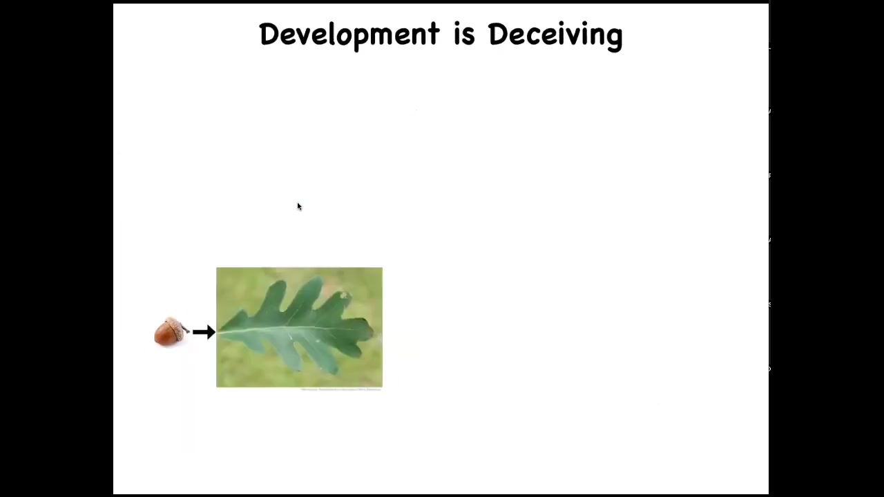 One interesting fact is that development is very deceiving. It's deceiving because it is so reliable, because it works so well most of the time. When you look at an acorn, and you know that all of the time the acorns develop into trees, you get the feeling that what the oak genome has learned to do is to make these things nice, flat, green, same kind of patterns all the time. But it turns out humans are not the only bioengineers.