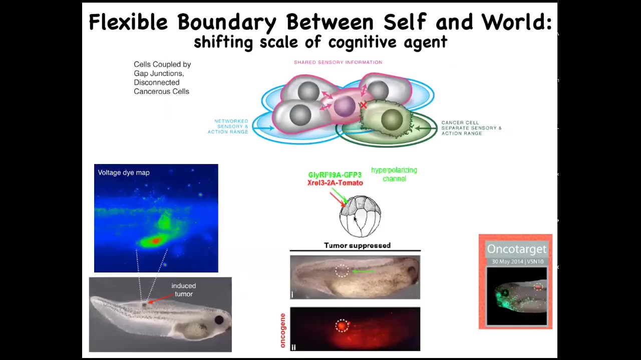 But that process has a failure mode. That failure mode is cancer. You can see here: when individual cells disconnect from this electrical network, they treat the rest of the body as external environment, then they roll back to their ancient unicellular kinds of behaviors. They're not more selfish. Cancer cells are not more selfish than regular cells. Their selves are smaller. You can see this kind of inflation and scaling of the boundary between self and world.