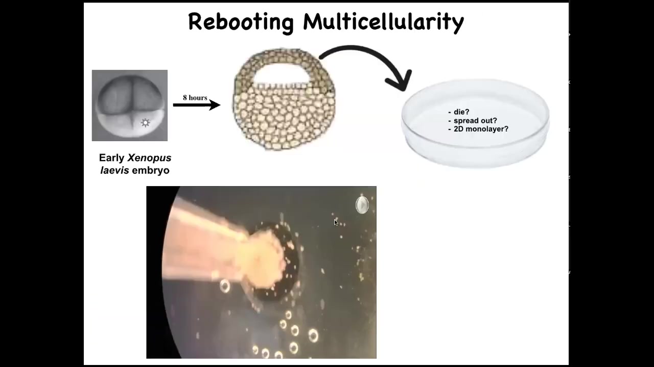 I want to introduce you to these things, which are called Xenobots. And what we started doing was to take some early ectodermal cells off of a frog embryo, liberate them and put them in a petri dish. They could do a number of things. They could die. They could spread out and walk away from each other. They could form a two-dimensional monolayer. What they do instead is they coalesce together into this little organoid-looking thing. And then they start to move.