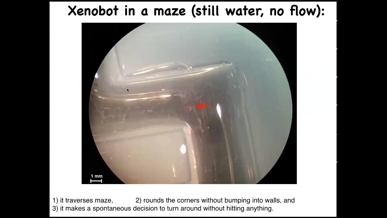 Here's a Xenobot doing a maze. Watch what happens. It swims down here. At this point, it takes the corner without having to bump into the opposite wall. Then, due to some internal dynamics we don't understand, it decides to turn around and go back where it came from. They have autonomous behavior — we're not pacing it, we're not controlling it. It has autonomous swimming behavior. Lots of interesting behaviors.