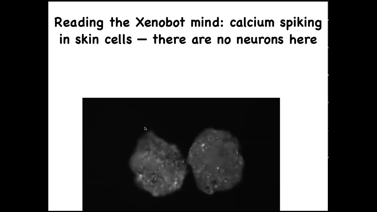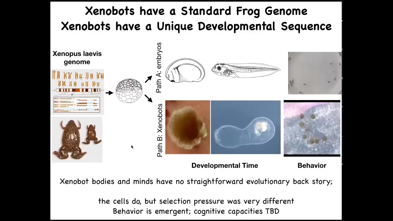 But these cells can also make xenobots with their own weird developmental progression. They have different behaviors. This is really important. If there's never been any xenobots, there's never been any selection to be a good xenobot; where does this come from? Where do these behaviors and capabilities come from? We once again remember that it is not just about selection; it is about the fact that evolution makes some very reprogrammable, very competent problem-solving hardware that in novel configurations can do different things.