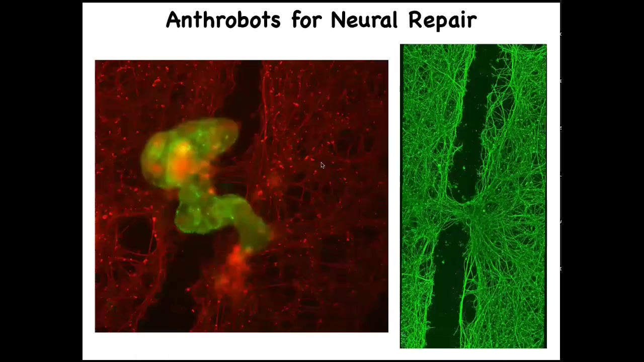 This is a PhD student in my group, Gizem Komushkaya, who did all this anthrobot work. Imagine, in the future, your own body cells, no transgenes, no gene therapy, can be deployed to help repairs. Who would have known that your tracheal cells that sit there quietly for decades are able to form a little biobot that moves around on its own and heals neural wounds? What other kinds of capabilities do they have? We don't know. This is the first thing we try. They probably have all kinds of other competencies. They don't require any immune suppression because they're made of your own cells.