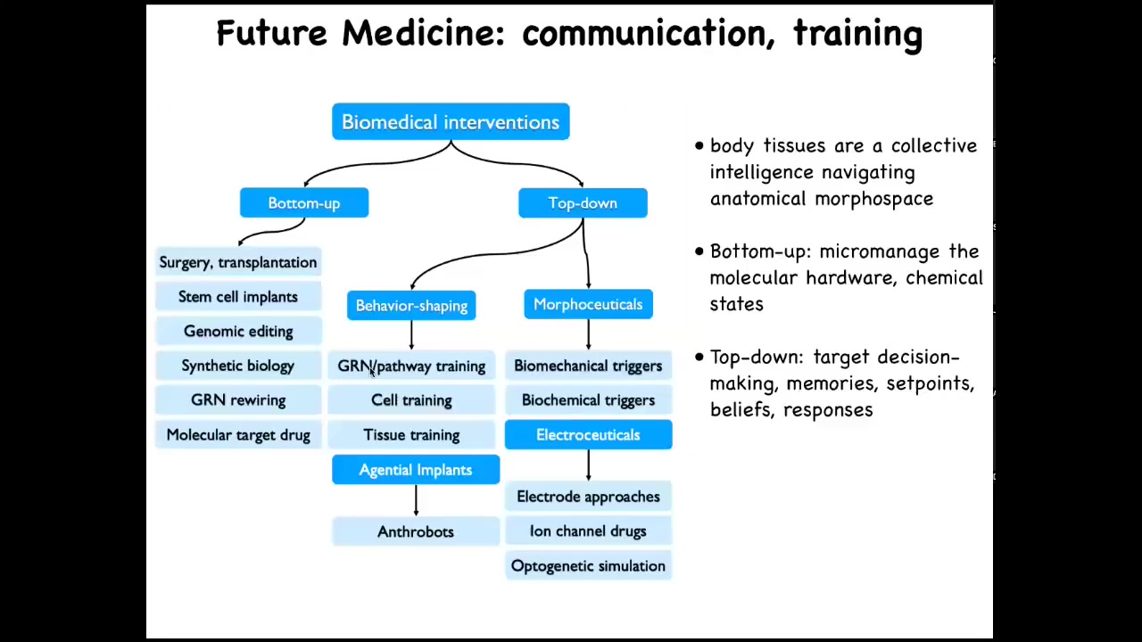 They share with you the priors about what health and disease is, which low agency interventions like drugs and implants are not going to have. So this is what I think of as the landscape for biomedicine going forward. This is all the familiar bottom-up tools that we have today. But complementing them is this whole developing area of top-down interventions, including behavior shaping, which we didn't even talk about as far as training cells and tissues, and then using agential implants and things like that. The various morphoceuticals, including electroceuticals, are being used to rewire not the hardware, but actually to change their behavioral landscape. So the idea is that you're not micromanaging their molecular state. What you're doing is targeting their decision-making, their memories, their set points, their beliefs, literally the models they make of their micro-environment based on past experience — are they going to fight you on the things that you want them to do.