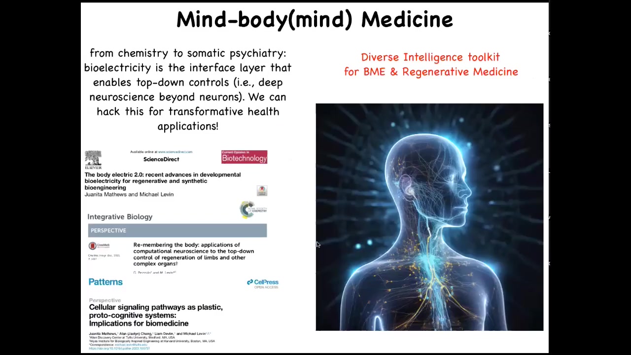 The diverse intelligence community, who work on understanding problem solving and intelligence in unconventional substrates, have a lot to say to biomedical engineers and regenerative medicine workers. These two fields need to come together in an important way. The medicine of the future is going to be much more like somatic psychiatry, less like chemistry. Bioelectricity is at least one. There may be others, but it's at least one interface that enables us to exploit the mind of the body. If you want to go deeper, a lot of the more general, more philosophical stuff is in these papers.
