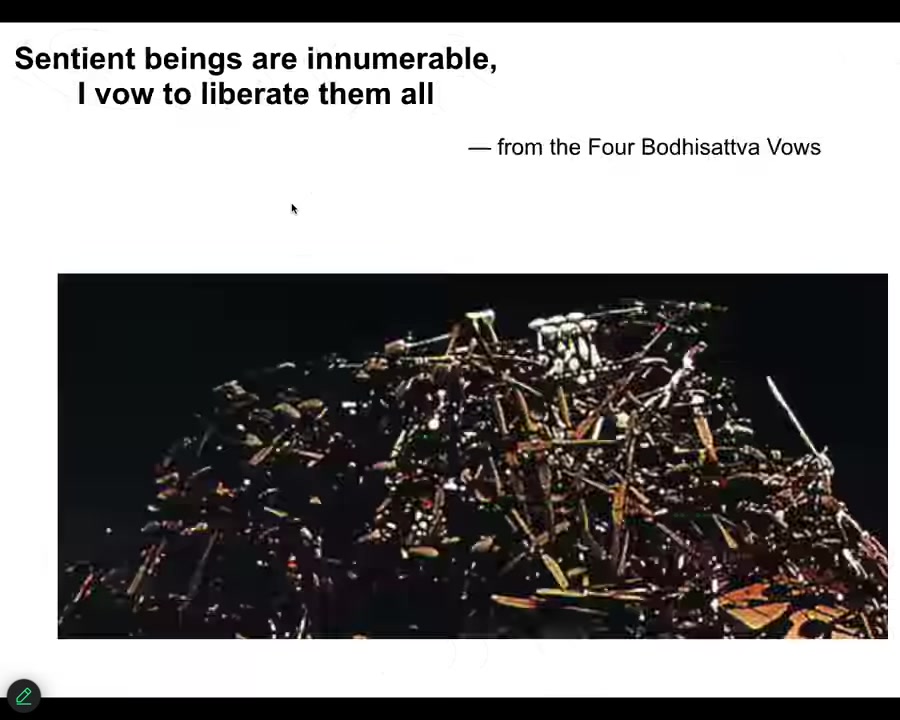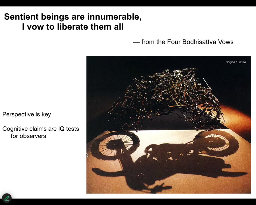 I find this particularly interesting. There's a piece of one of the four Buddhist vows that says, "Sentient beings are innumerable. I vow to liberate them all." There are several interesting pieces here. First of all, this notion of enumeration that, if something is going to be innumerable with an E, so able to be numbered, there needs to be some kind of effective procedure for recognizing them. In other words, there should be some algorithm or some way that we're going to find all of these sentient beings. You need to do that if you're going to liberate them or at the very least relate to them ethically. I would like to point out that we have a lot of difficulty doing that.