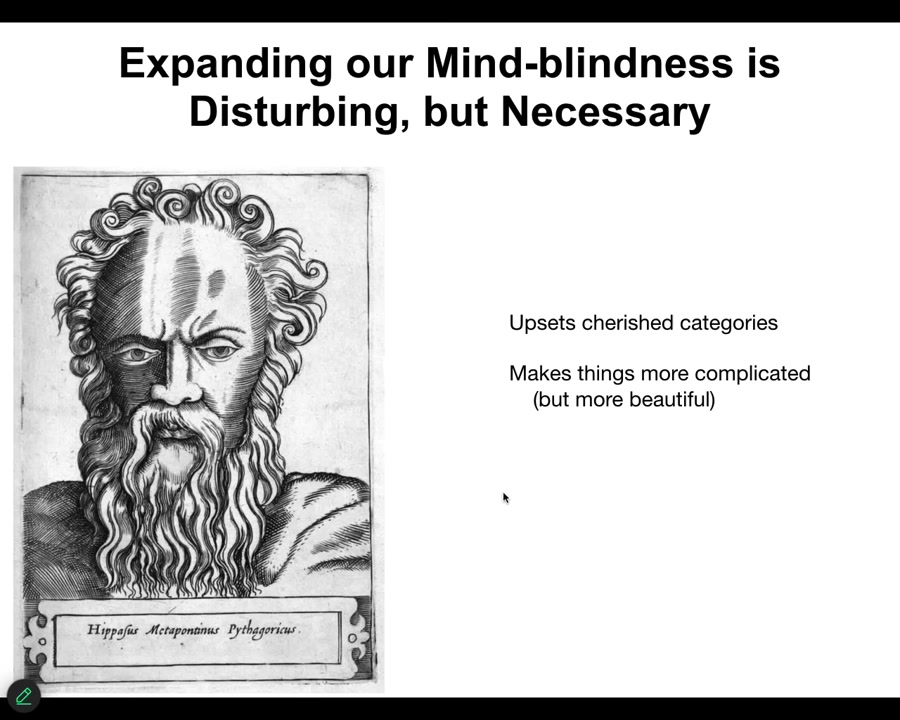 And it's disturbing and disruptive. And we know this, this poor guy got drowned at sea for talking about irrational numbers, because these things upset very ancient categories. And when you upset ancient categories, there's a lot of resistance. And what I'm about to tell you makes things much more complicated, but more beautiful, and more meaningful.