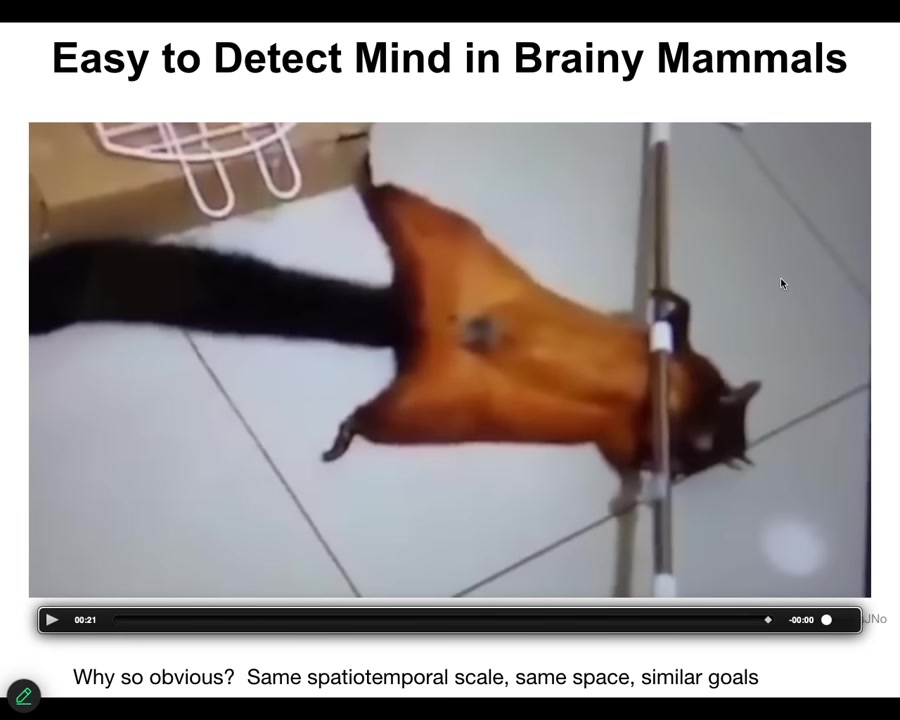 So those kinds of things are pretty easy for us to detect. So here's this little squirrel. He's going to set up an accident scene here. You can see he knows precisely what he's doing. There he is. He's going to set this up. He's going to look to see if his owners are noticing this. If they're paying attention to this whole thing that he did, he wants some attention. So he's checking whether anyone's looking at this. And so this kind of stuff is easy for us to recognize because it happens at the same spatial-temporal scale as us. It happens in the same three-dimensional space. These beings have similar goals to ours. It's easy for us to recognize this kind of thing.