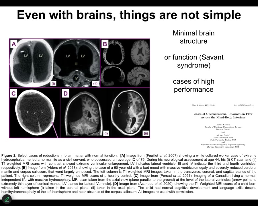 Although I will say that even the story with brains is not that simple, because there are amazing clinical cases, and we reviewed them in this paper, where humans have extremely small amounts of brain tissue. So not nearly enough, as modern neuroscience would tell you, is needed for normal performance. And yet they have normal or above-normal performance. And so what's going on here? Even the case with the brain is not really obvious. That's the first thing.
