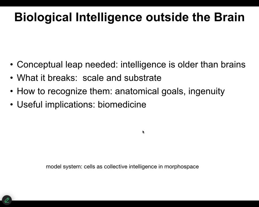 But we're going to go significantly outside the brain. And so we're going to take a few conceptual leaps. We're going to talk about the fact that intelligence is way older than brains. And what it breaks is our assumptions of scale and our assumptions of substrate. And the way we're going to recognize these intelligences is by noticing their anatomical goals and the degree of ingenuity that they can deploy in what they're doing.