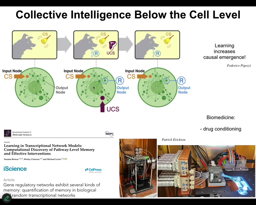 The material that these cells are made of, the molecular networks, are themselves capable of six different kinds of learning. You don't need a cell for this. You don't need the nucleus or anything else. Just the small pathway of chemicals turning each other on and off can be sufficient for habituation, sensitization, and associative conditioning. We study this in these papers. In our lab, we're using all of that, for example, for the biomedical purpose of drug conditioning to try to form and erase specific memories in these molecular pathways that are important for health and disease.