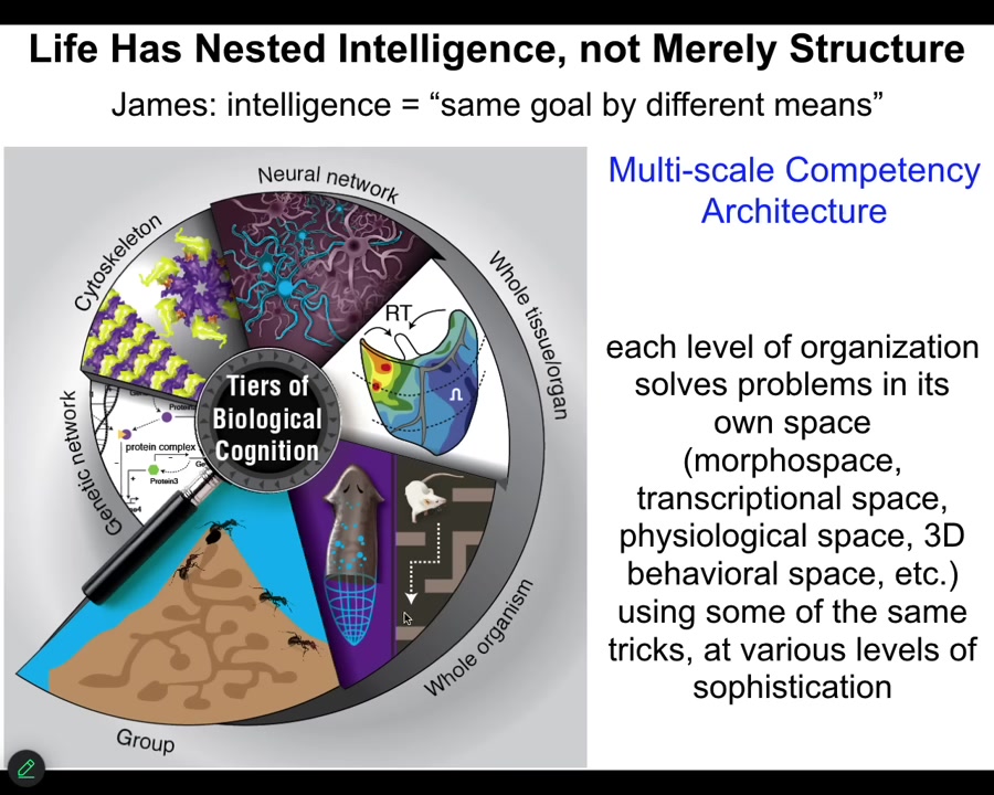 We're starting to see that there are different kinds of properties that are important for cognition all throughout the architecture that we're made of. At the level of molecular networks and subcellular components and cells and tissues and organs, and even up through groups. Every level of this multi-scale competency architecture is solving problems in different spaces. When I say intelligence, I'm using William James's definition, the ability to reach the same goal by different means. We'll unpack this in a minute. We consist of this agential material.