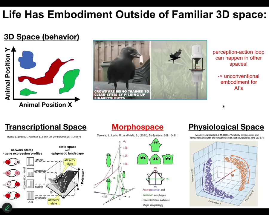 But what it does mean is that when you see something that isn't embodied in the conventional sense, meaning it doesn't have a robotic body that allows it to move around in the 3D world, that doesn't mean it's not embodied. So brain organoids, AIs — people say, if it doesn't engage with the real world, it's not really cognitive. You may not know the space with which it's engaging, because what's important is this loop, this perception, decision, action loop, and that loop can happen in many spaces, not just the three-dimensional space.