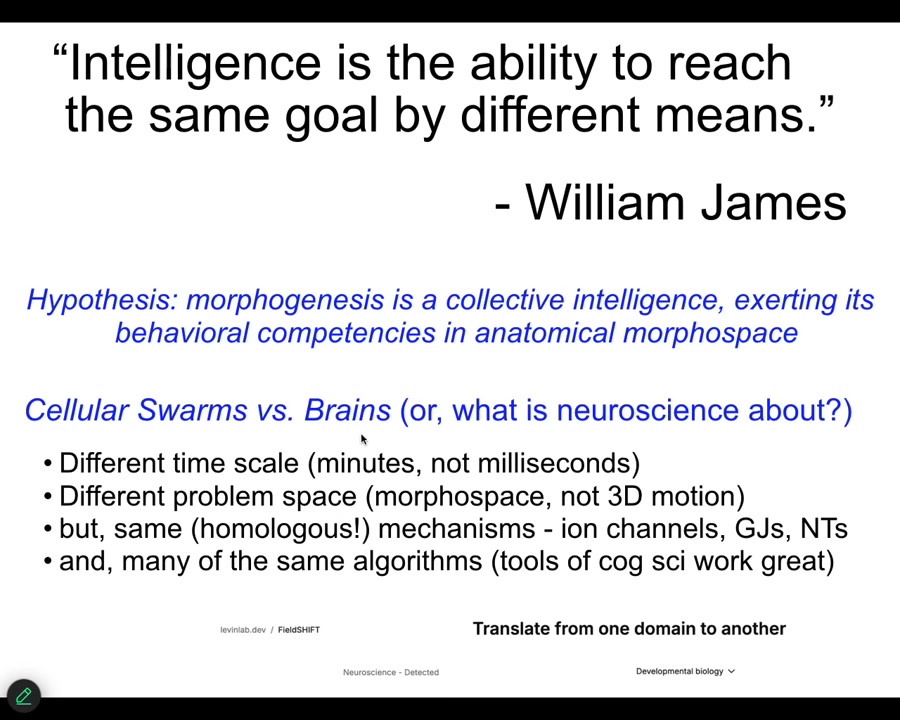 William James's definition: "intelligence is the ability to reach the same goal by different means." This is something we've been working on for years: the hypothesis that morphogenesis is a collective intelligence exerting behavioral competencies in anatomical space.